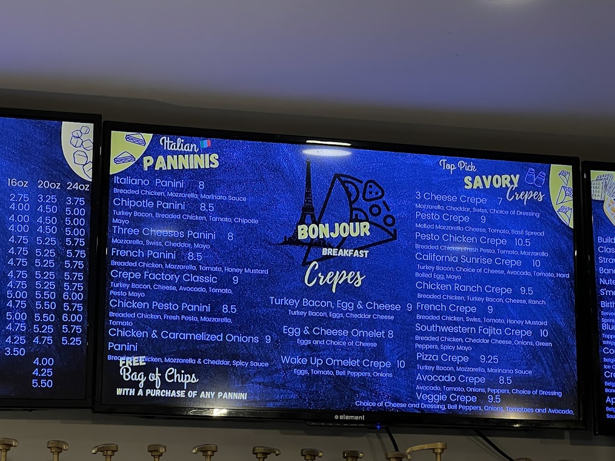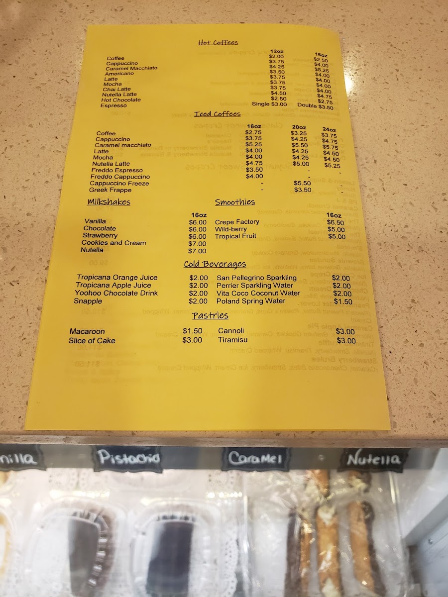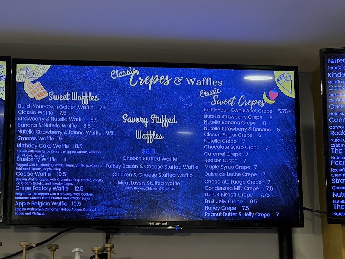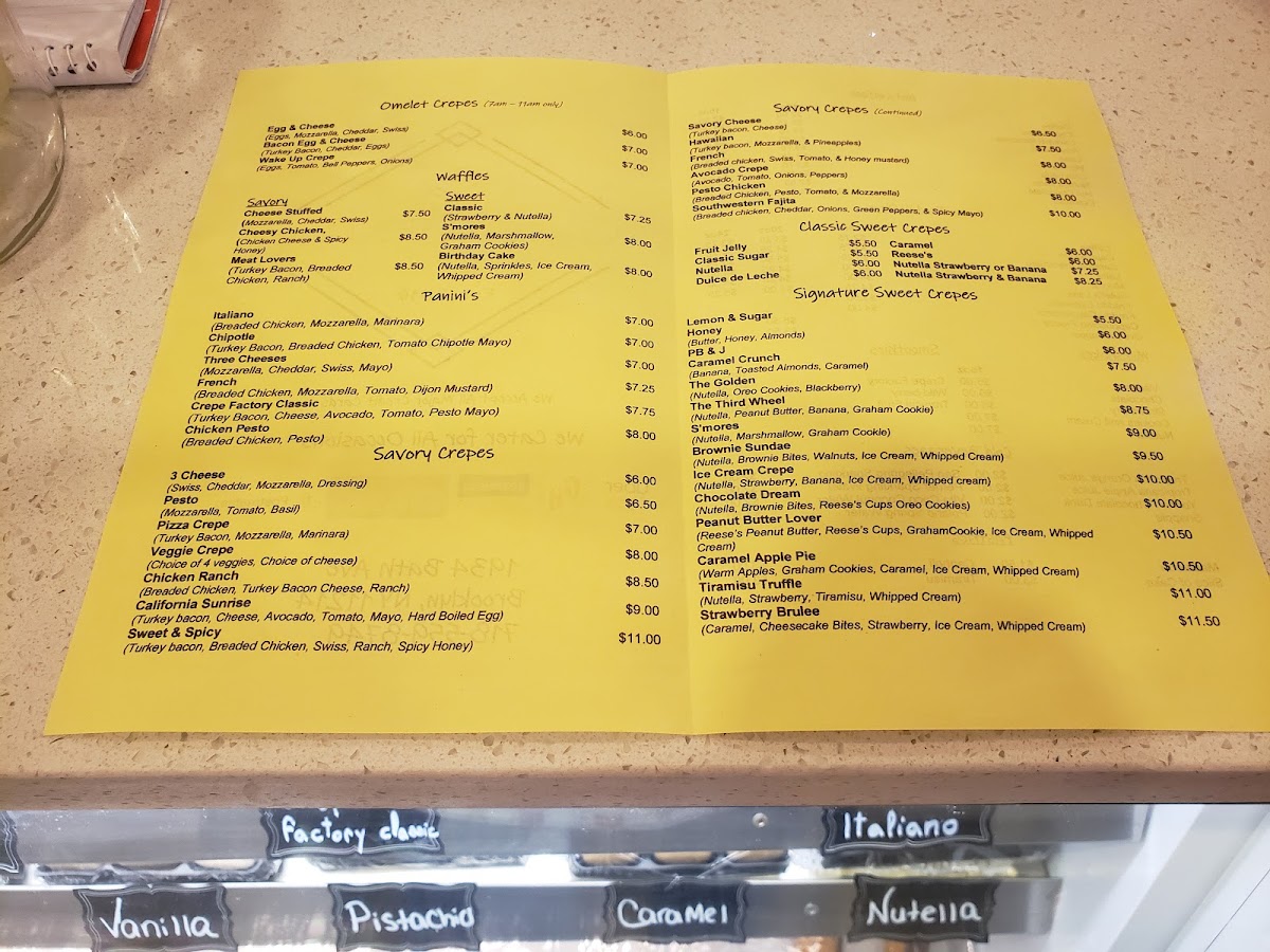 From a reviewer's perspective, the menu at Crepe Factory on 1934 Bath Ave offers an impressively diverse selection that caters to every craving. Savory fans can indulge in Cheese Stuffed, Meat Lovers, or Chicken, Cheese & Spicy Honey waffles, while 3 Cheese, California Sunrise, and Chicken Ranch savory crêpes showcase creative fillings. Sweet options abound with Signature Sweet Crêpes like the Brownie Sundae Crepe, Honey Crepe, and Caramel Crunch Crepe, alongside Classic Sweet Crêpes such as Chocolate Syrup Crepe, Reese's Crepe, and Fruit Jelly Crepe. For those seeking extra indulgence, the Rice Pudding Stuffed Crepes-including Coconut Rice Pudding Crepe and Nutella Rice Pudding Crepe-add a unique twist. Waffle lovers are treated to Birthday Cake, Strawberry & Nutella, and S’mores Cookie Waffle, while panini options like Crepe Factory Classic and Italiano satisfy savory cravings. The dessert selection extends to French Macarons (12 Macarons Per Box), Chocolate Fudge Cake, Chocolate Mousse, and the inventive Ice Cream Cookie Sandwich featuring combinations like Chocolate Chunk Cookie & Chocolate Ice Cream. Beverage choices complement the menu with Hot Americano, Nutella Latte, Iced Mocha, and fresh smoothies including Tropical Fruit and Crepe Factory Smoothie. New items such as the Oreo Cheesecake Crepe, Brownie S’mores, and Cannoli Crepe add excitement for regular visitors. Overall, the menu demonstrates a thoughtful balance of classics and inventive creations, offering something for every palate.